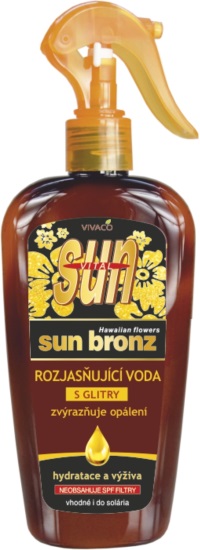 Opalovací voda se zářivými glitry pro rozjasnění pokožky a zvýraznění efektu bronzové pleti. Obsahuje TYROSIN Bronz akcelerátor pro urychlení zhnědnutí pokožky. Zvláště vhodné pro ošetření obličeje a exponovaných partií vystavených UV záření, písku a mořské soli. Doporučujeme kombinovat s ochraným opalovacím prostředkem.Vhodné i do solária. Neobsahuje UV filtry.
